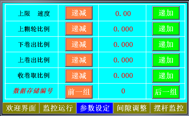 2)【上糊輪比例】【下卷出比例】【上卷出比例】【收卷取比例】對應數據即為倍率數據(若上主速度為A ,上糊輪速度即為A*對應倍率)